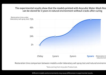 Az Anycubic Water Washable resin formulájának köszönhetően a kinyomtatott modellek kevésbé hajlamosak repedezni. Gyári tesztek igazolják, hogy több, mint 3 év alatt sem deformálódik és törik el a megfelelően tárolt és nyomtatott alkatrész.